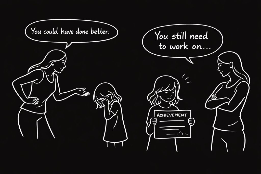 Achievements were acknowledged briefly, if at all, before attention shifted to flaws, improvements, or what someone else had done better.